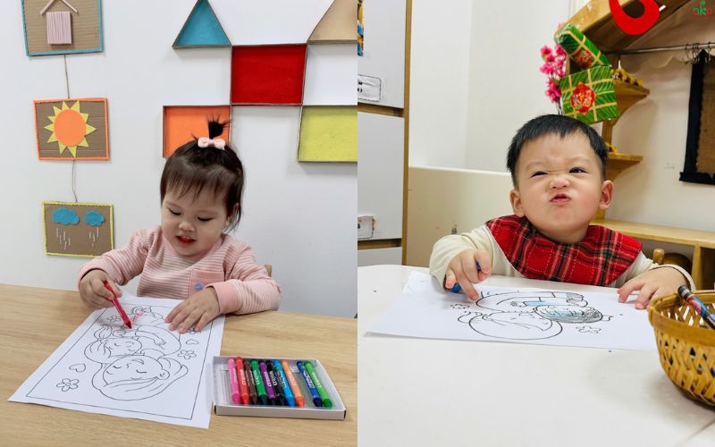 Qua hoạt động nhỏ này, các con không chỉ được làm quen với màu sắc, tập cầm bút thật chắc tay mà còn được nuôi dưỡng tình cảm gắn kết, học cách yêu thương người mẹ tuyệt vời của mình nhiều hơn.